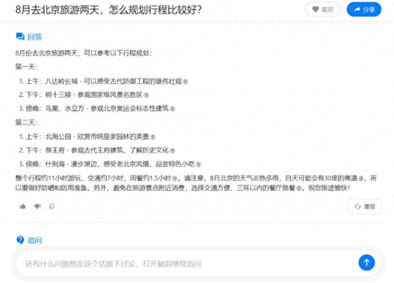 与传统搜索引擎相比,天工 AI 搜索使意图识别成为可能,用户完全可以通过自然流畅的对话式交互来清晰表达自己的意图,从而获得精准、有效且个性化的答案。例如,用户可让天工 AI 搜索制定行程规划。