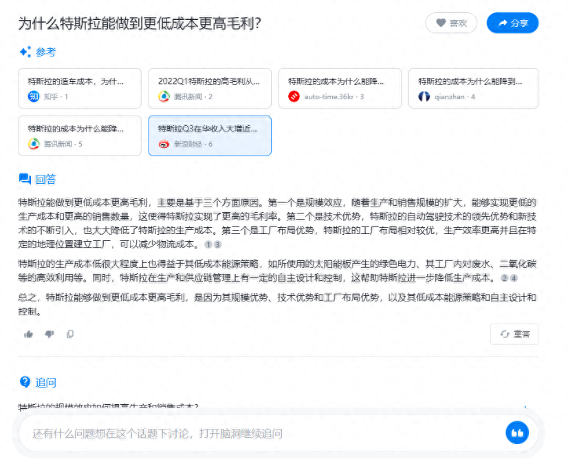 IT之家从昆仑万维了解到,天工 AI 搜索的“追问”功能让用户可以就一个问题展开 20 轮次以上交互,以此展开深度探索。大模型使得 AI 搜索具备了整合、提炼、串联信息的能力,因此 AI 搜索能更好地应对开放式问题,在处理知识类以及创意类搜索时,其体验与效率将远胜于传统搜索引擎。