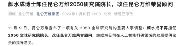 除了面对商业化的挑战之外,昆仑万维还迎来了重大人事变动。2024年11月9日,公司的AI“主心骨”颜水成宣布离任,不再担任2050全球研究院院长,改任公司荣誉顾问。