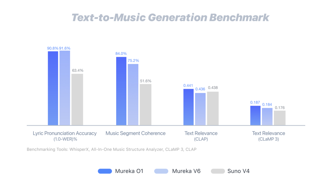 在我们的实际测试中,发音唱对率、乐段准确率、文本相关度、制作质量等客观指标,Mureka V6都显著优于Suno V4。通过下述主流的开源模型对生成音乐进行分析测试,Mureka O1在发音清晰程度、生成乐段的精准度上遥遥领先。