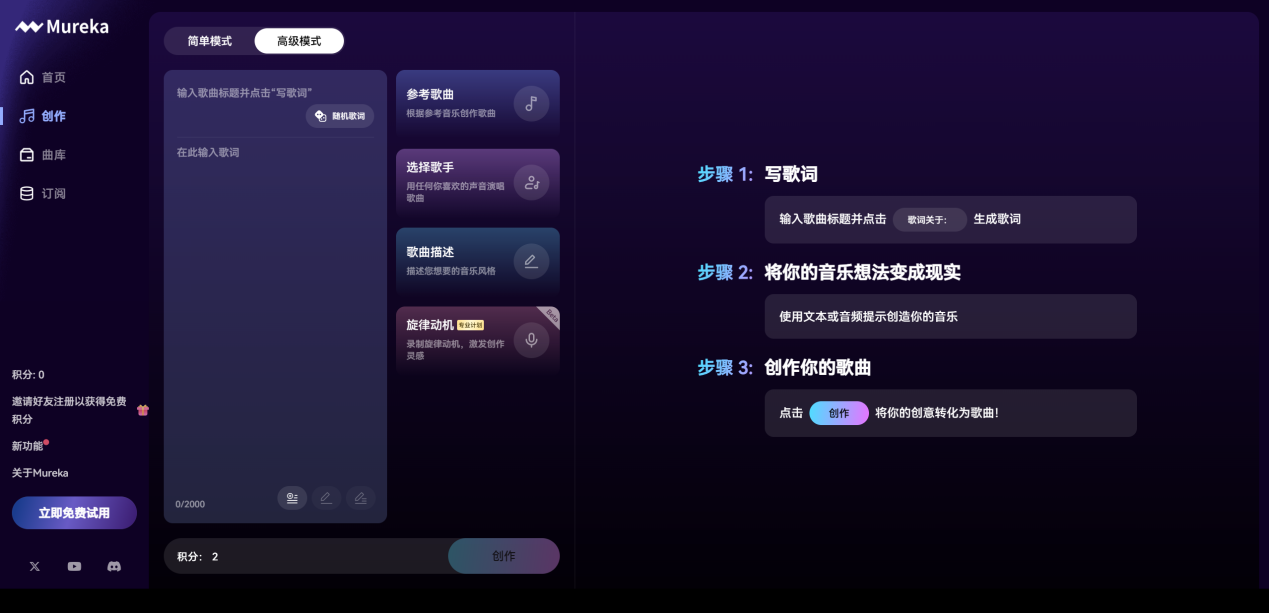2025年3月,公司正式推出Mureka O1模型及Mureka V6模型。作为全球首个音乐推理大模型的Mureka O1,其性能全面超越Suno,成功登顶SOTA,再次向全球展示了中国科技的实力,继续引领AI音乐行业的发展潮流。Mureka也开放了国内登录入口和API,满足国内用户需求。