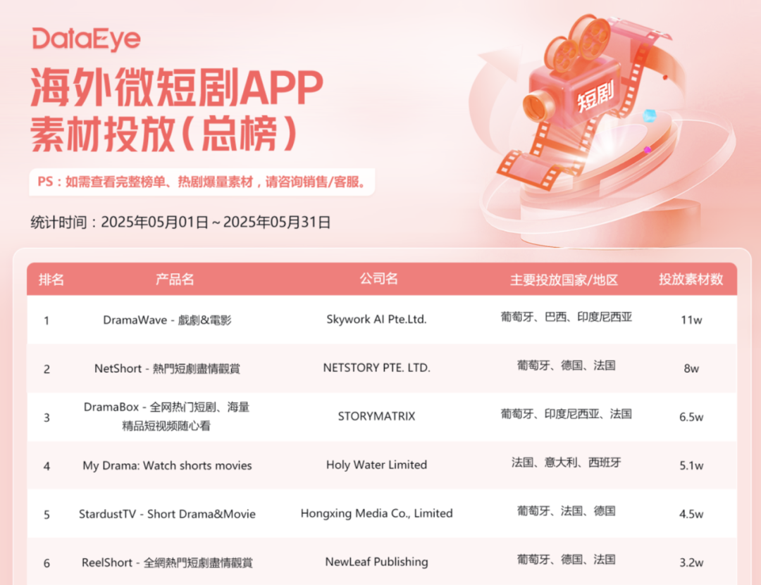 一个APP,要想被更多的人知晓、使用,营销是很常见的市场推广方式,以短剧为例,DataEye短剧观察的数据显示,今年5月,海外微短剧APP素材投放的第一名,就是昆仑万维的DramaWave。