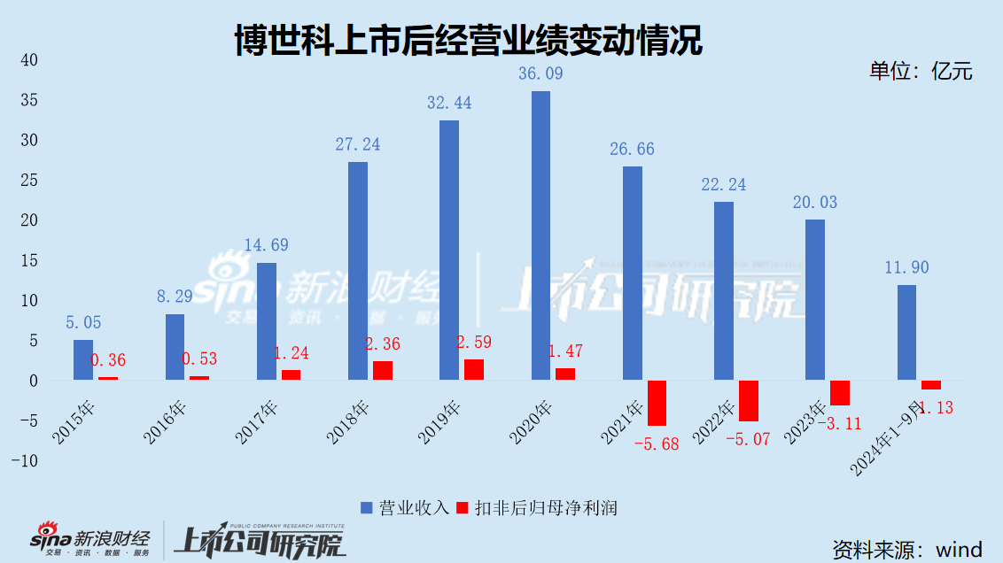 2015年2月,博世科于创业板首发上市,10年间经营业绩坐上“过山车”。2015—2020年,博世科营业收入从5.05亿元增至36.09亿元,净利润从4289.23万元增至1.92亿元,复合增长率分别高达53.12%和35.52%。