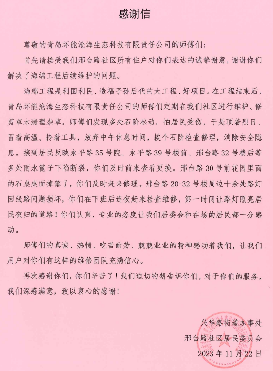 通过上述各式各样的工作,用真心实意的服务赢得了居民对环能沧海的良好口碑和声誉,也进一步获得了居民们对海绵城市的信任和支持。