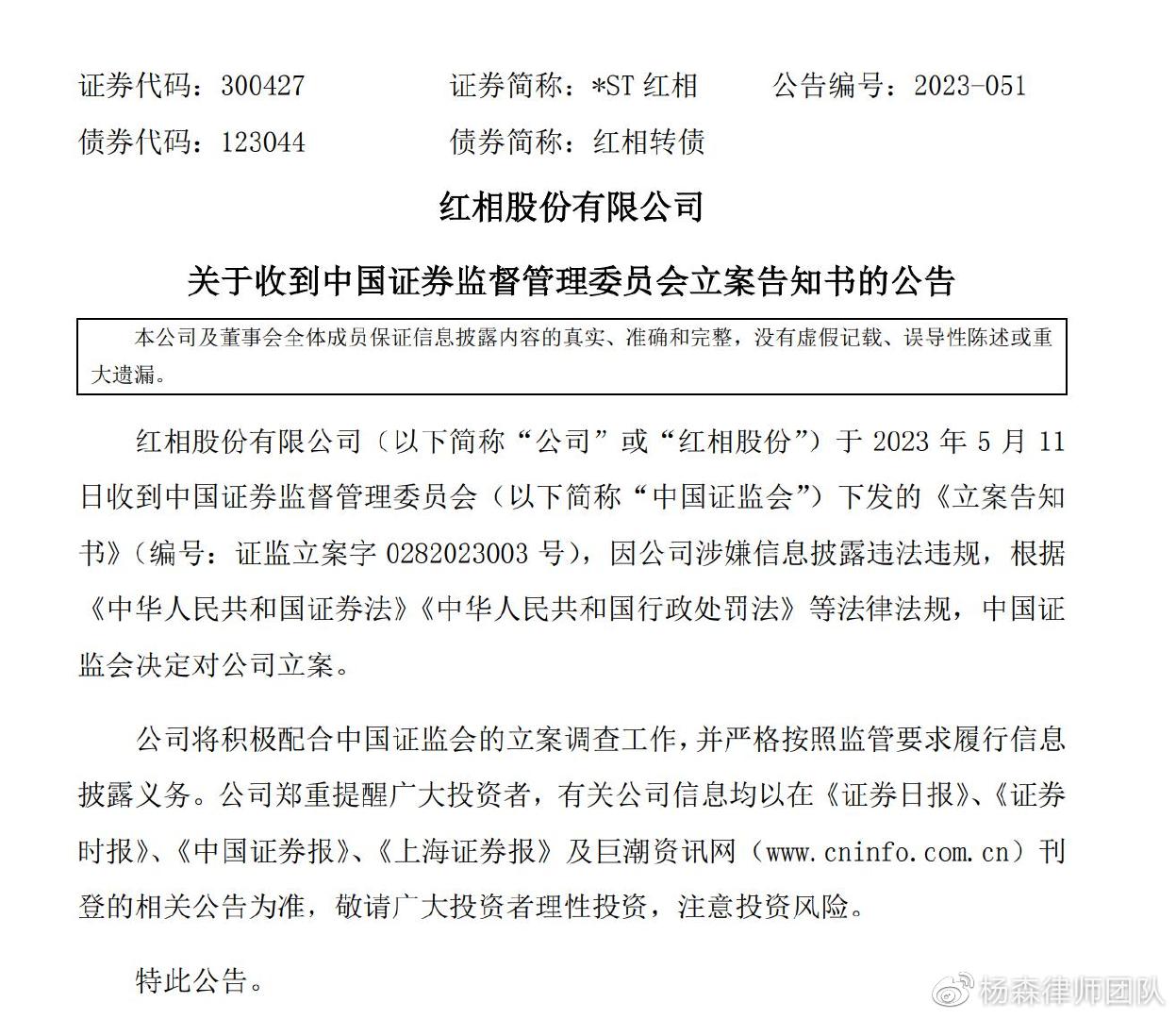 2023年5月11日,红相股份有限公司(简称红相股份、ST红相或者公司)披露,于2023年5月11日收到中国证监会下发的《立案告知书》(编号:证监立案字0282023003号),因公司涉嫌信息披露违法违规,根据《中华人民共和国证券法》《中华人民共和国行政处罚法》等法律法规,中国证监会决定对公司立案。