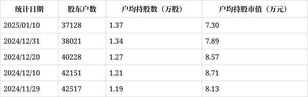 从1月15日公开信息显示,红相股份截至2025年1月10日公司股东户数为3.71万户,较上期(2024年12月31日)减少893户,降幅为2.35%,变化不大。