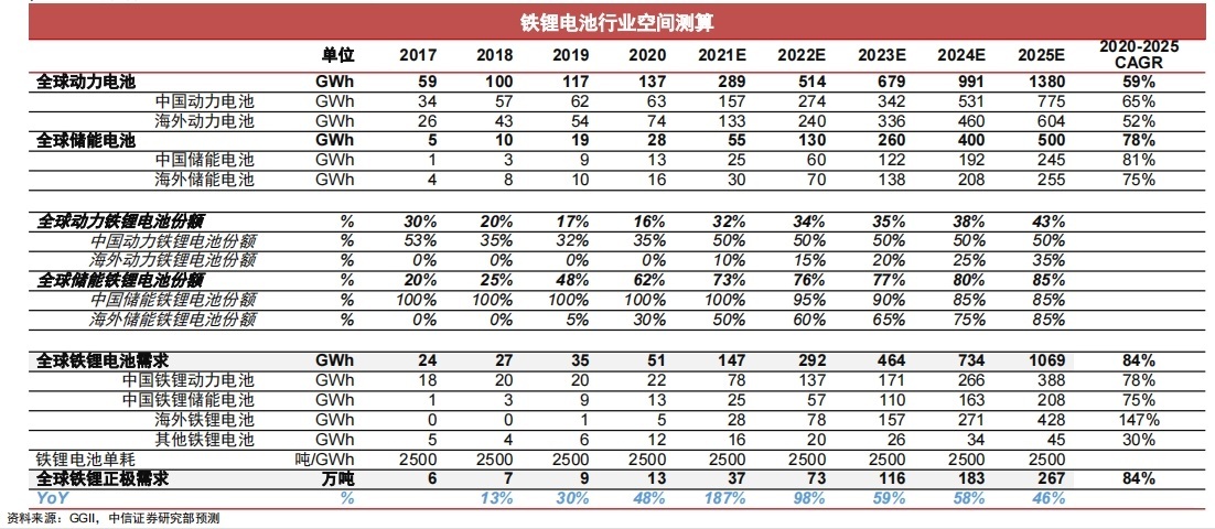 中信证券预计,到2022年底,全国磷酸铁锂可利用产能将达到约300万吨。而中信证券对需求端的预测则显示,预计全球磷酸铁锂正极材料在2021年和2022年的需求分别约为37万吨和73万吨,即便全球需求在2020~2025年以年均84%的复合增长率增长,到2025年全球的需求总量也仅为267万吨,尚未超过我国2022年底的预计产能。