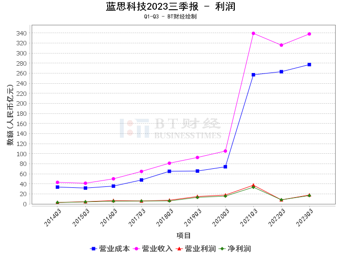 再次,从营业收入和利润来看,蓝思科技2023年三季度的营业收入为3.38百亿元,较上年同期的3.16百亿元有所增长。营业利润为17.77亿元,较上年同期的8.14亿元增长显著。净利润为16.59亿元,较上年同期的8.11亿元增长显著。这些数据表明,公司的营业收入和利润都保持了稳定的增长。