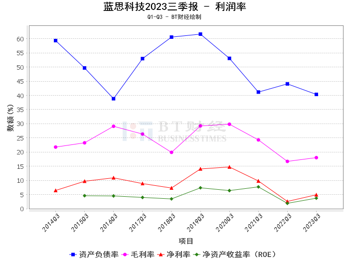 其次,从盈利能力来看,蓝思科技2023年三季度的毛利率为18.03%,较上年同期的16.7%有所提升,表明公司的盈利能力有所增强。净利率为4.91%,较上年同期的2.57%显著提高,显示出公司的净利润增长较快。净资产收益率(ROE)为3.71%,较上年度末的1.9%有所提升,这表明公司的盈利能力和资本运营效率有所提高。