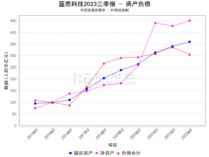 首先,从资产负债表来看,蓝思科技2023年三季度末的资产总计为7.55百亿元,相较于上年度末的7.83百亿元有所下降。负债合计为3.04百亿元,相比上年度末的3.4百亿元也有所减少。这表明公司在资产和负债管理上有所改善,负债水平有所降低。同时,公司的净资产为4.5百亿元,较上年度末的4.44百亿元略有增长,显示出公司的净资产积累能力。