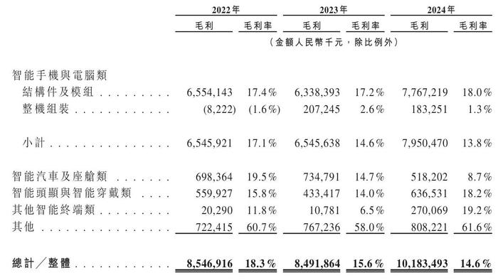 更不容乐观的是,蓝思科技的毛利虽然由2022年的85.47亿元增至2024年的101.83亿元,但在收入与利润尚能维持增长的背景下,其毛利率却与前两项业绩指标背道而驰,由2022年的18.3%降至2024年的14.6%。