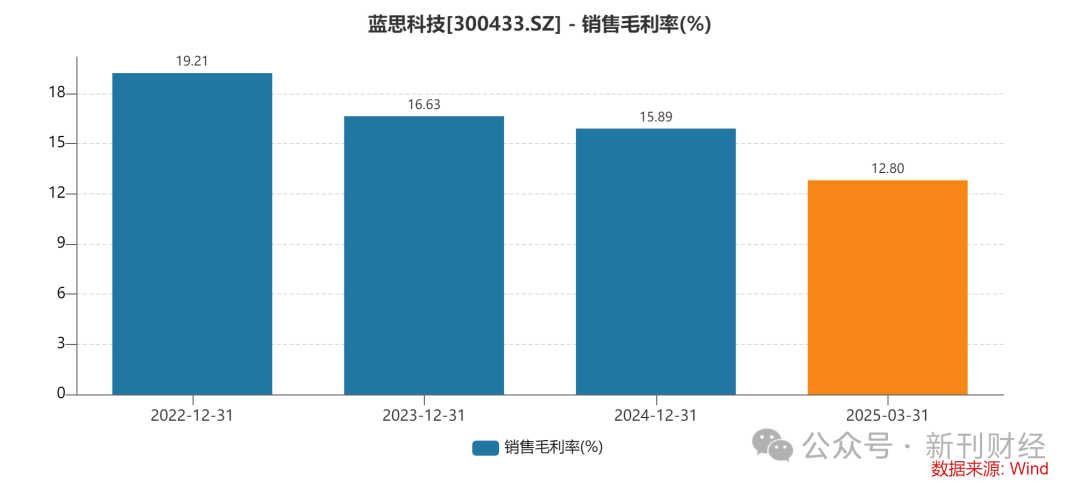 盈利能力方面,根据数据显示,2025年一季度,蓝思科技的销售毛利率录得12.8%,较2022年末的19.21%下滑6.41个百分点,且呈现逐步下行趋势。
