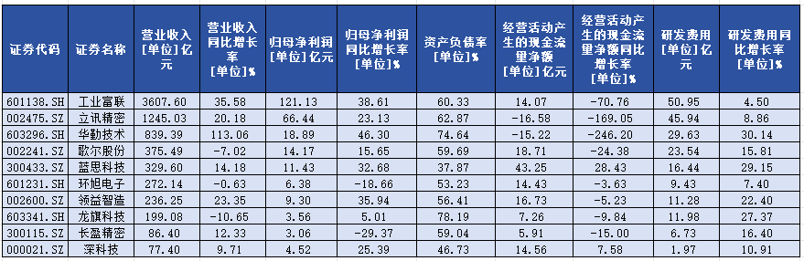 从整体业绩来看,消费电子零部件及组装板块上半年累计收入达到8199.2亿元,同比增长27.12%,归母净利润收入297.29亿元,同比增长25%;按季度来看,二季度营收环比增速达到18.69%;归母净利润环比增速达到26.33%。季度业绩环比改善趋势明显。