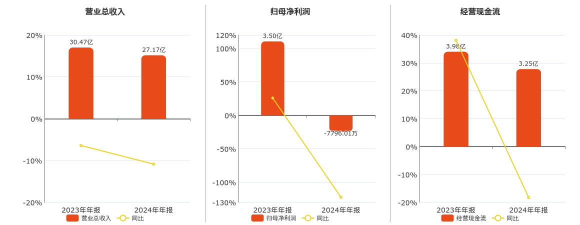 公司营业总收入为27.17亿元,较去年同报告期营业总收入减少3.31亿元,同比较去年同期下降10.86%。归母净利润为-7796.01万元,较去年同报告期归母净利润减少4.28亿元,同比较去年同期下降122.27%。经营活动现金净流入为3.25亿元,较去年同报告期经营活动现金净流入减少7281.42万元,同比较去年同期下降18.30%。