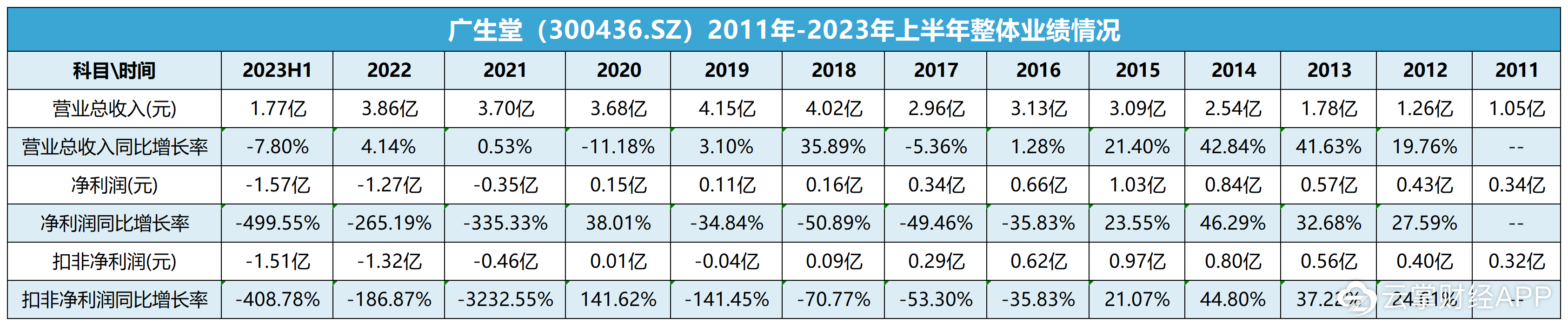 但是在上市之后,广生堂的业绩大“变脸”,不仅总营收一直维持在3亿元至4亿元的体量,增速不明显,而且净利润每年持续下滑,从2016年的6641.3万元至2021年、2022年分别亏损3488.66万元、1.27亿元,2023年上半年更是延续亏损至1.57亿元。