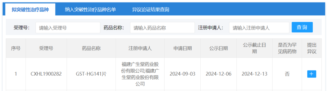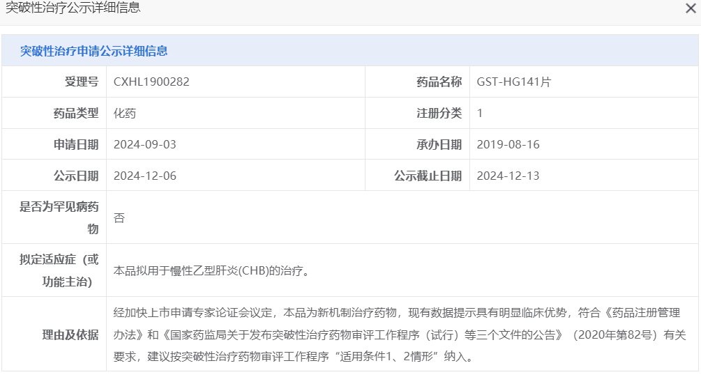 12月6日,CDE官网显示,福建广生堂药业的GST-HG141片拟纳入突破性治疗品种,适应症为:用于慢性乙型肝炎(CHB)的治疗。