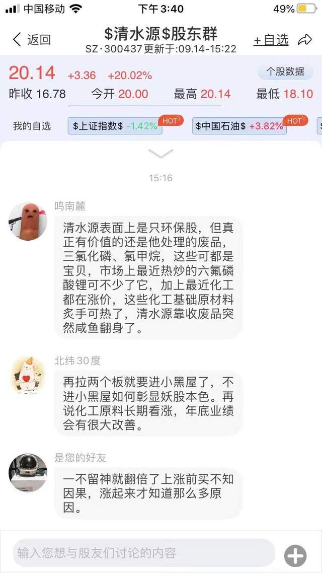 在尺度的清水源股东群,有投资者称,翻倍涨起来才知道,原来清水源炒的是化工产品,还有投资者称,化工原料长期看涨,年底公司业绩会有很大的改善。