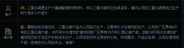9月6日,清水源此答复投资者问询时说,三氯化磷产品为公司自己生产,主要用于水处理剂的生产,公司老厂区具有6万吨的三氯化磷产能,18万吨水处理剂扩建项目新厂区具有10万吨三氯化磷产能,目前18万吨水处理剂扩建项目仍处于试生产阶段尚未达产。