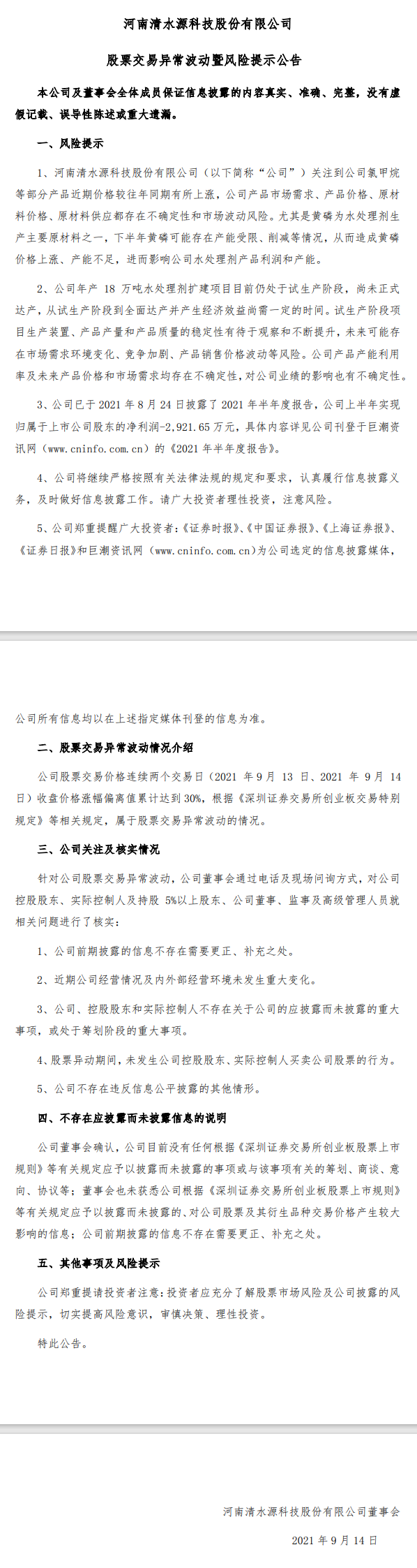 2021年9月14日,河南清水源科技股份有限公司发布公告,由于氯甲烷等产品近期价格上涨,公司产品原材料价格、市场需求、原材料供应存在市场波动风险。同时,由于黄磷价格上涨,产能不足,影响公司水处理产品利润和产能。目前,公司年产18万吨水处理剂扩建项目处于试生产阶段,要全面达产并产生经济效益还需一定时间,并在未来市场存在风险。公司产品的产能利用率、未来产品价格、市场需求等方面都存在不稳定性,对公司业绩影响也不确定。