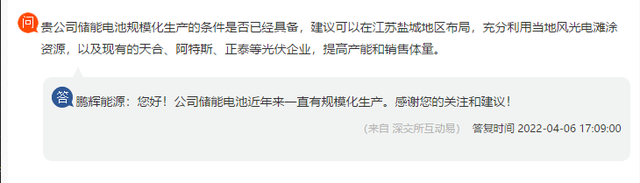 鹏辉能源还强调,公司储能电池近年来一直有规模化生产。