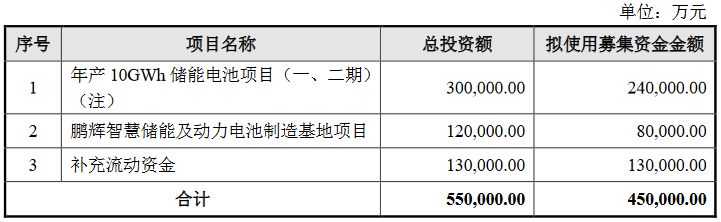鹏辉智慧储能及动力电池制造基地项目由全资子公司柳州鹏辉能源科技有限公司负责实施,总投资额为12亿元,拟投入募集资金8亿元,主要生产储能及新能源汽车锂电池,达产后可形成年产5.5GWh产能。