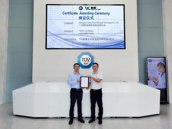 近日,TUV南德意志集团(以下简称"TUV 南德")为广州鹏辉能源科技股份有限公司(以下简称"鹏辉能源")的GSP 42173205F型号储能电芯产品颁发了其全球首张IEC 62619:2022认证证书,助其顺利进入国际市场。TUV南德新能源检测(广东)有限公司总经理欧阳强友先生、鹏辉能源储能技术专家吴候福先生等嘉宾出席了该证书的颁发仪式。