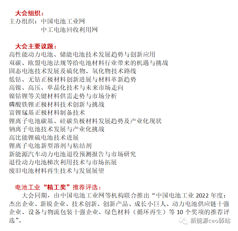 会议背景:为探索动力和储能电池低碳发展路径,及时了解最新相关研究成果和产业发展动态,加强行业和产学研交流,推动我国锂离子电池正负极材料产业保障和技术进步,由中国电池工业网、中工电池回收利用网将于2022年12月26-27日联合在广东省举办“第三届锂离子电池正负极材料技术与市场大会暨2022年中国动力电池回收利用行业年会”。