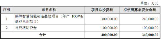 下调募资额后,拟发行募集资金总额不超过34亿元,其中24亿元用于鹏辉智慧储能制造基地项目(年产10GWh储能电池项目),10亿元用于补充流动资金。