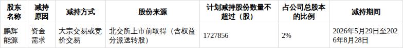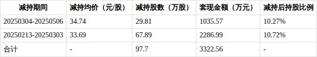 2025年3月4日至2025年5月6日,减持29.81万股,减持套现金额为1035.57万元。本次减持过后,鹏辉能源持股比例降至10.27%。