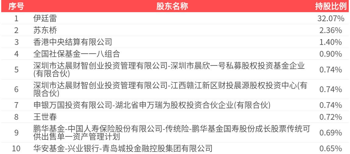 公司股东户数为2.54万户,前十大股东持股数量为1.31亿股,占总股本比例为41.00%,前十大股东持股情况如下: