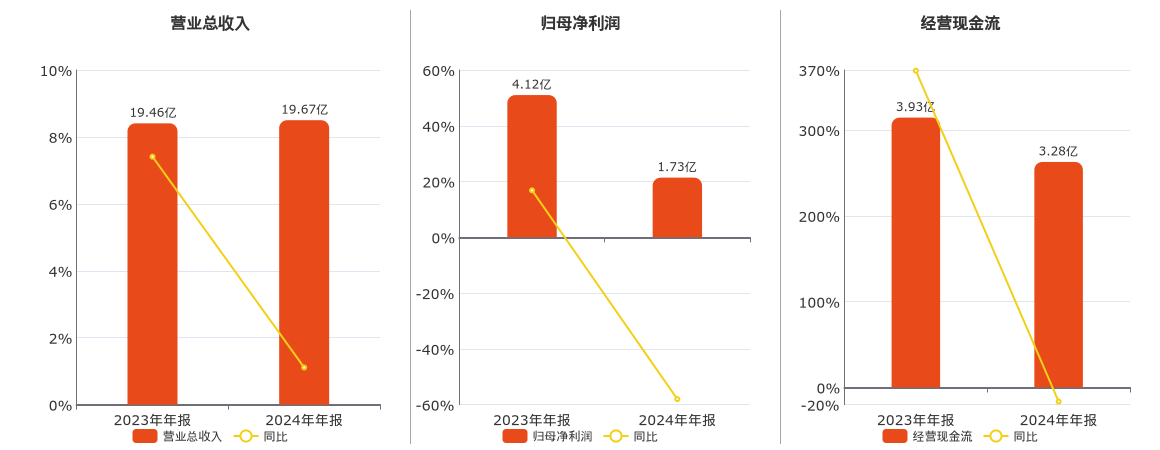 公司营业总收入为19.67亿元。归母净利润为1.73亿元,较去年同报告期归母净利润减少2.39亿元,同比较去年同期下降58.03%。经营活动现金净流入为3.28亿元,较去年同报告期经营活动现金净流入减少6446.98万元,同比较去年同期下降16.42%。