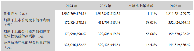 2024年,金雷股份实现营业收入19.67亿元,同比增长1.11%;归属于上市公司股东的净利润1.73亿元,同比下降58.03%;归属于上市公司股东的扣除非经常性损益的净利润1.74亿元,同比下降55.68%;经营活动产生的现金流量净额3.28亿元,同比下降16.42%。