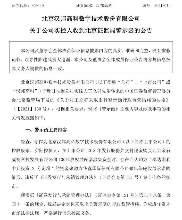 北京证监局根据《上市公司信息披露管理办法》(证监会令第40号)第五十九条的规定,决定对汉邦高科采取出具警示函的行政监管措施。