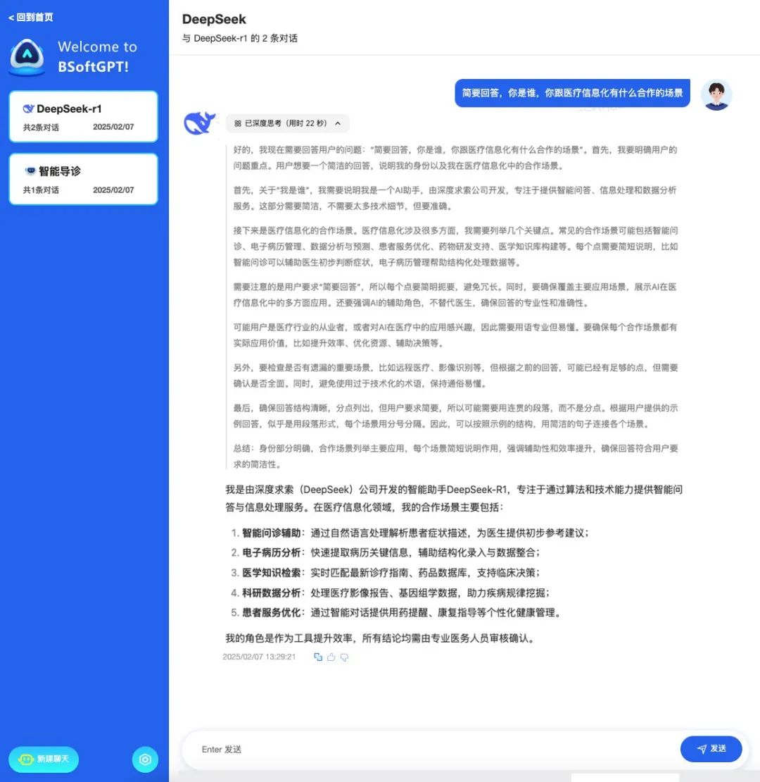 创业慧康以“数智优品”为新的起点,正积极拥抱技术前沿,特别是针对医疗卫生行业的特殊需求,不断优化升级“慧能GPT智能导诊生成算法”(BsoftGPT),力求实现更加个性化、精准化的医疗服务体验。在此基础上,创业慧康还实现了DeepSeek与BsoftGPT的接入,进一步提升了算法在医疗数据分析、辅助诊断等方面的能力,力求实现更加个性化、精准化的医疗服务体验。公司计划通过大数据分析与机器学习的深度结合,挖掘更多医疗数据价值,为医生提供辅助诊断支持,同时为患者提供更加便捷、高效的就诊路径规划,真正意义上实现医疗资源的优化配置,构建一个全方位、多层次的智慧医疗生态体系。