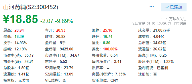 1月5日,截至收盘,山河药辅(SZ300452)收跌9.89%,现报18.85元,成交额4.04亿元,总市值34.02亿元。