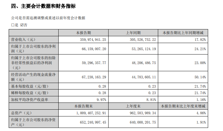 8月1日晚间,山河药辅(SZ300452,股价13.65元,市值32亿元)披露2022年半年度报告。报告显示,公司上半年度实现营业收入3.6亿元,同比增长17.82%;归属上市公司股东的净利润6615.9万元,同比增长24.21%,扣非净利润5929.6万元,同比增长23%。