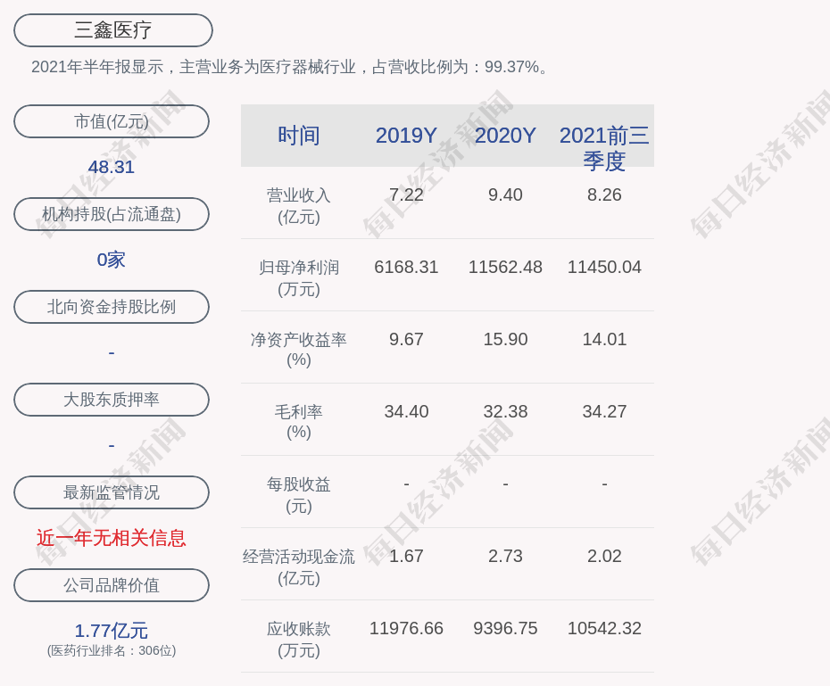 2021年半年报显示,三鑫医疗的主营业务为医疗器械行业,占营收比例为:99.37%。