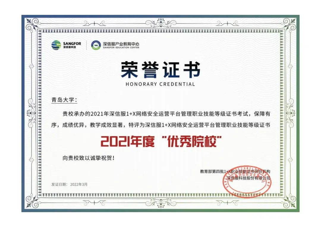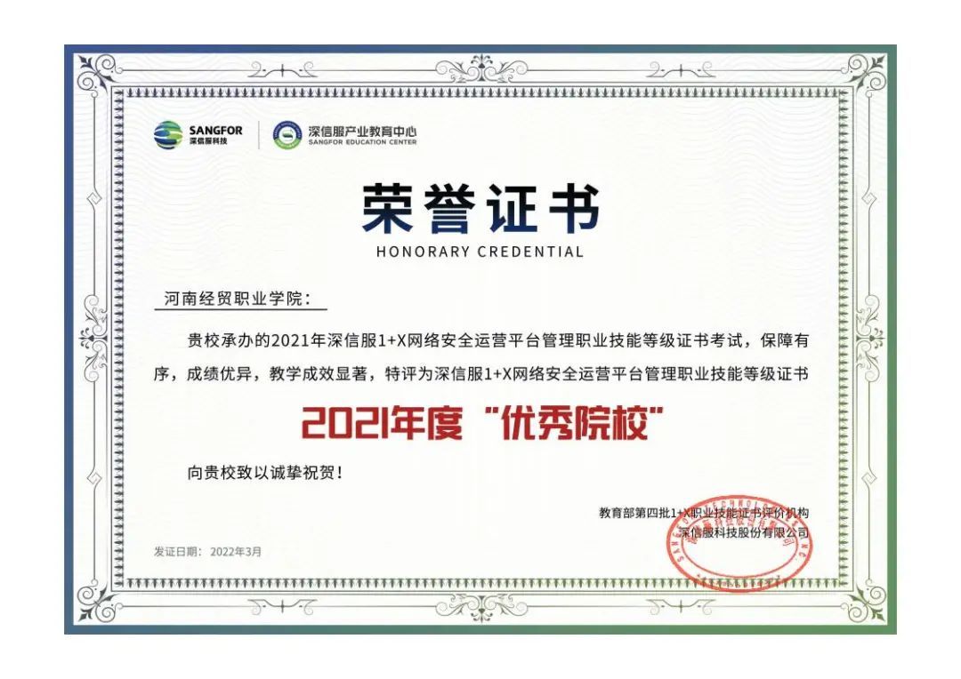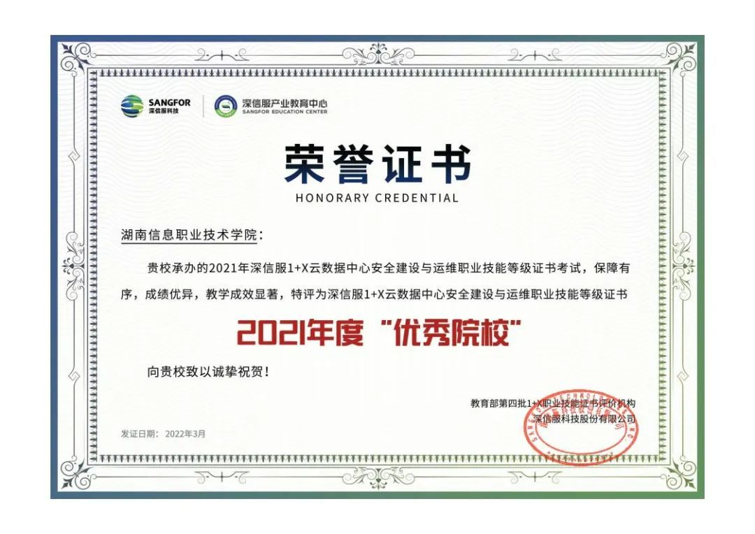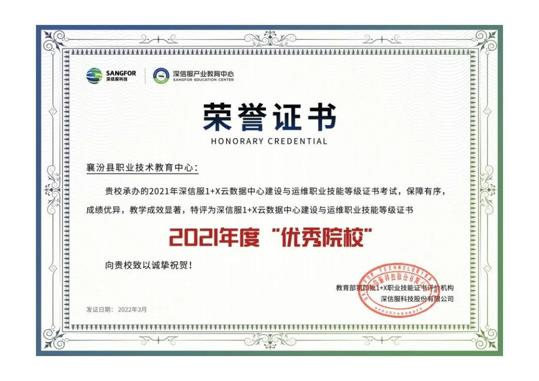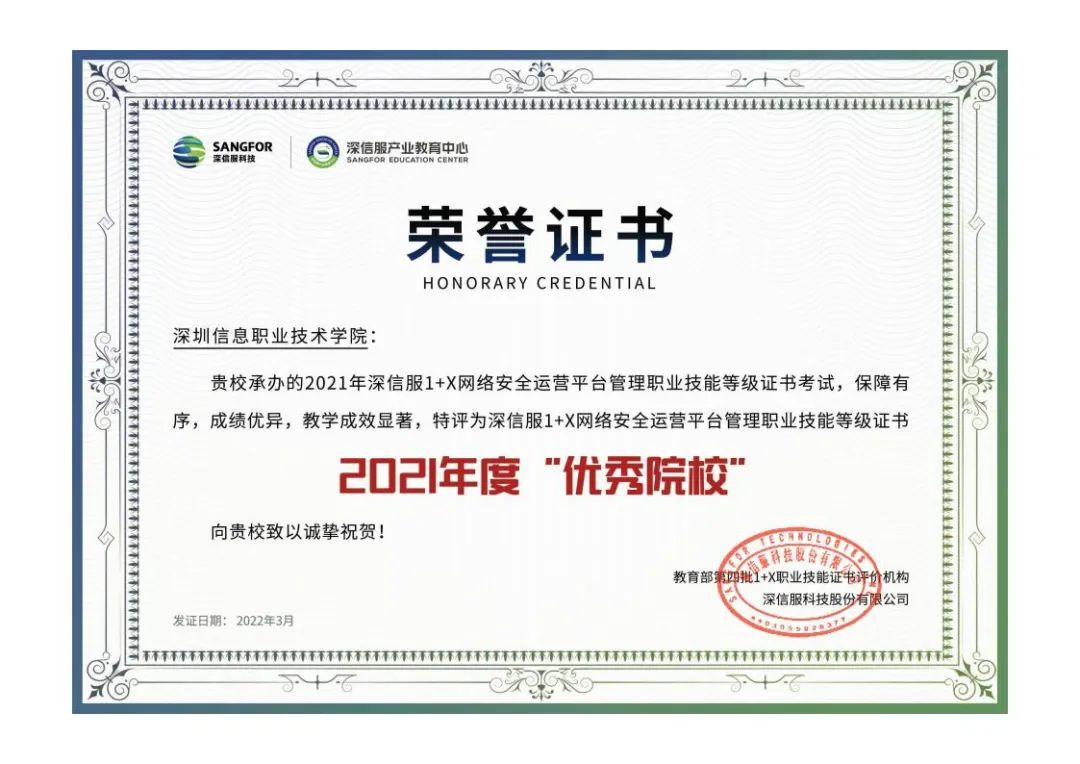 基于2021年度试点合作院校参与师资培训人数、学生试点参与人数、学生平台学习时长、考核通过率等综合因素的评估,深信服为深圳信息职业技术学院、青岛大学、河南经贸职业学院、郑州铁路职业技术学院、广东科学技术职业学院、山东劳动职业技术学院、安徽邮电职业技术学院、北京网络职业学院、安徽绿海商务职业学院、聊城职业技术学院、湖南信息职业技术学院、湖南大众传媒职业技术学院、襄汾县职业技术教育中心(以上院校排名不分先后)13所院校颁发2021年度“优秀院校”荣誉证书,鼓励更多试点院校积极参加深信服1+X免费师资培训,开通1+X免费课程资源,提升考核通过率,推进“岗课赛证”综合育人,助力人才培养与产业岗位需求高度匹配,帮助学生高质量就业。