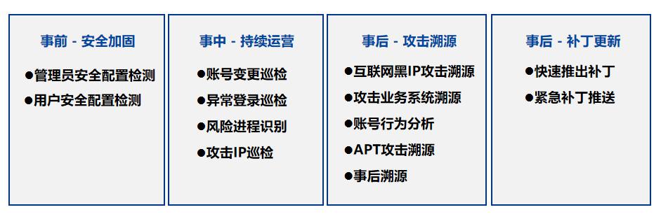 除了加强接入过程的防护以外,深信服零信任aTrust还提供了“加固、运营、溯源和补丁更新”四大闭环能力,能够针对攻击链,在事前进行安全加固、在事中持续进行检测响应、在事后进行溯源,并针对遇到的问题快速进行补丁修复,这样才能真正做好有效防御,构建攻防对抗中的安全防护闭环。