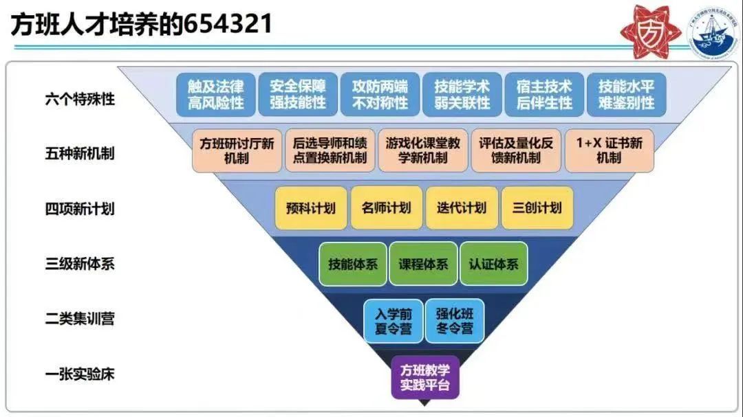 中国工程院方滨兴院士在会议中围绕“网络空间安全人才培养与认证”展开专题报告。报告从网络空间安全人才培养的6个特殊性入手,分析网安教育应该着重关注的关键问题,进而引出“方班”的人才培养理念,从高校、企业、研究院所人才培养协作新模式,系统化详细介绍了方班“654321”的人才培养体系。
