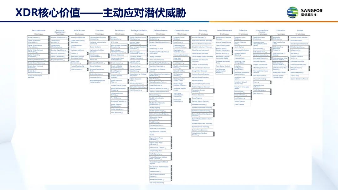 深信服SaaS XDR可覆盖ATTCK 264项技战术,无论是低成本、破坏性小的自动化攻击,还是到高级潜伏、破坏性大的0day漏洞攻击,都无所遁形。
