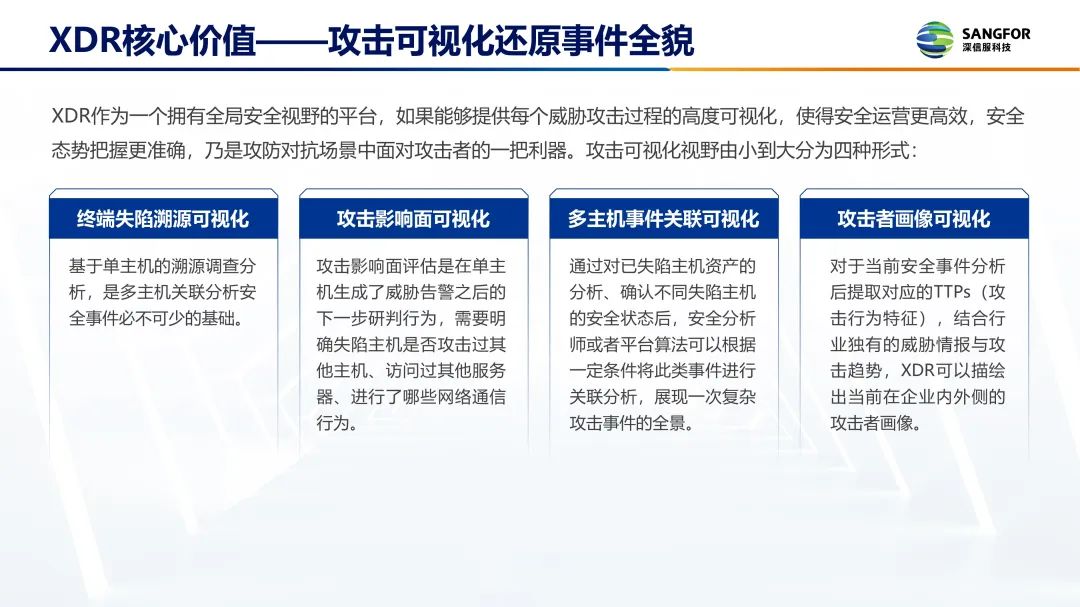 XDR需要从终端失陷溯源、攻击影响面、多主机事件关联和攻击者画像的视角,提供每个威胁攻击过程的高度可视化,使安全运营更高效、安全态势把握更准确。
