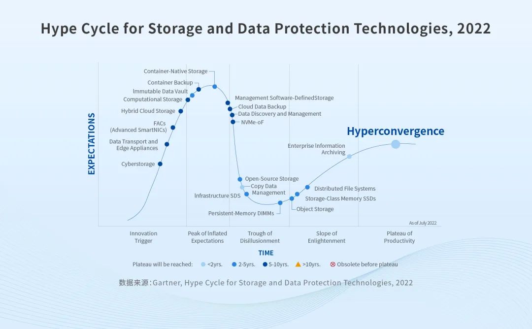 近日,全球权威咨询分析机构Gartner发布了《2022存储与数据保护技术成熟度曲线报告》(Hype Cycle for Storage and Data Protection Technologies, 2022),报告分析超融合技术已达到生产力成熟期。深信服凭借在超融合领域的优秀表现,成为报告中该领域唯一入选的中国厂商。
