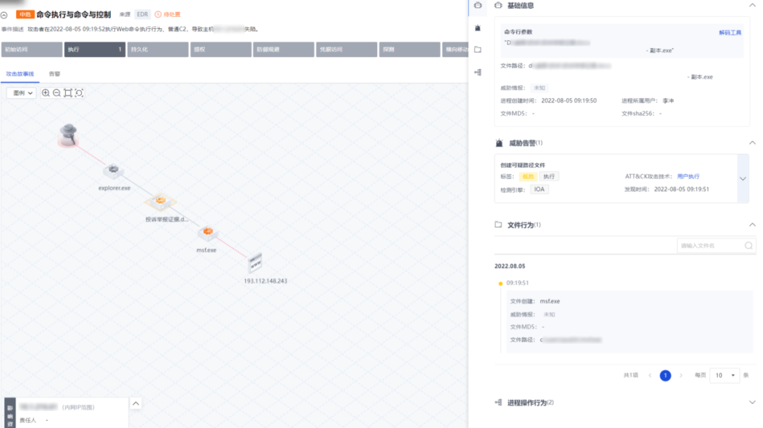 7月25日,深信服XDR检测到红队利用某OA服务器0day漏洞对某三甲医院进行攻击。此次攻击绕过了多个防护设备,只有深信服XDR通过IOA行为检测引擎独报事件,获得用户高度认可。同时,深信服XDR通过可视化进程链,将红队外联下载远控木马、内网横向移动等攻击行为完整呈现。深信服MDR安全服务专家溯源研判效率由此提升至分钟级,并快速完成处置加固。