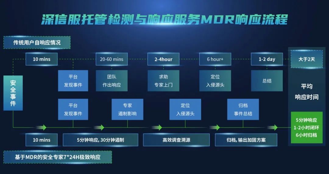 深信服XDR对接托管检测与响应服务MDR,实现云地协同7*24小时持续监测,平均5分钟响应、2小时闭环、6小时归档。