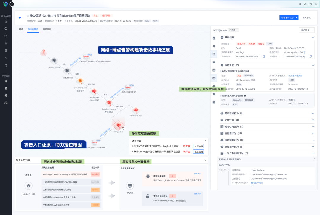 1个平台XDR:通过原生的流量采集工具与端点采集工具收集关键数据,通过网端聚合分析引擎对数据进行上下文关联分析,实现攻击链深度溯源;