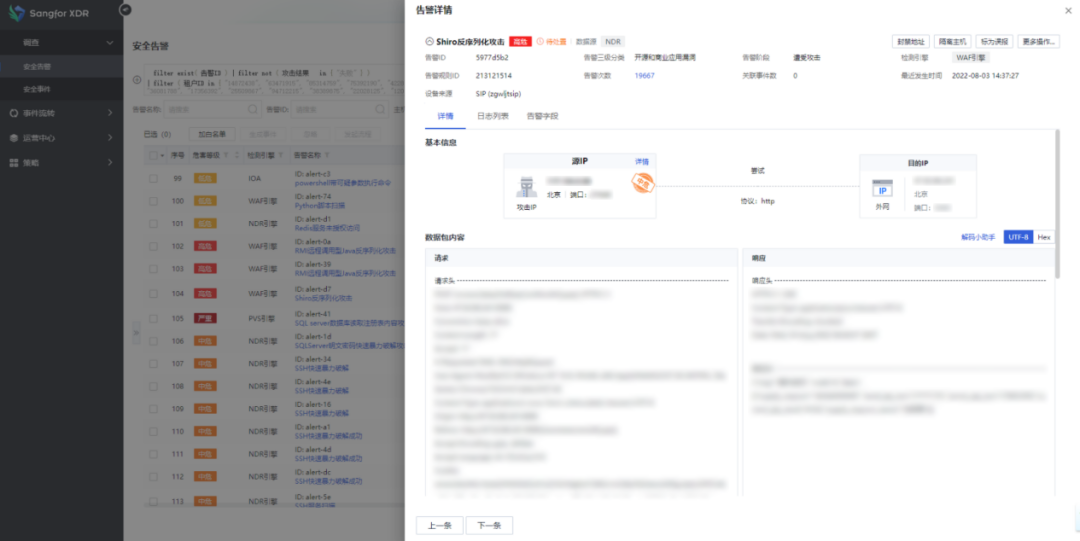 8月3日,深信服XDR检测出红队通过Shiro反序列化漏洞攻击某央企集团演示大屏系统。该漏洞使用加密流量传输,若攻击成功,将造成服务器失陷。MSS专属服务经理果断推送事件,用户立即下线系统进行整改。深信服XDR精准识别漏洞风险与高效应急响应的能力已深入人心。