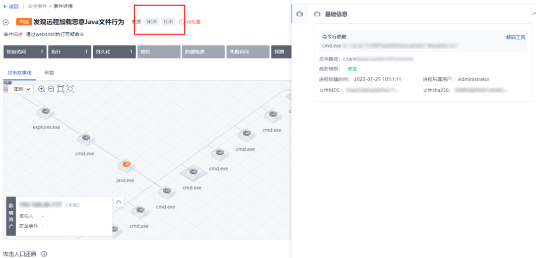 不用花几小时定位入侵源头,深信服XDR通过终端失陷溯源可视化能力,在告警详情页面直接展示攻击入口信息,溯源时间从小时级压缩至分钟级。同时平台在每个攻击的步骤上给出处置建议,帮助用户精准高效完成处置闭环工作。