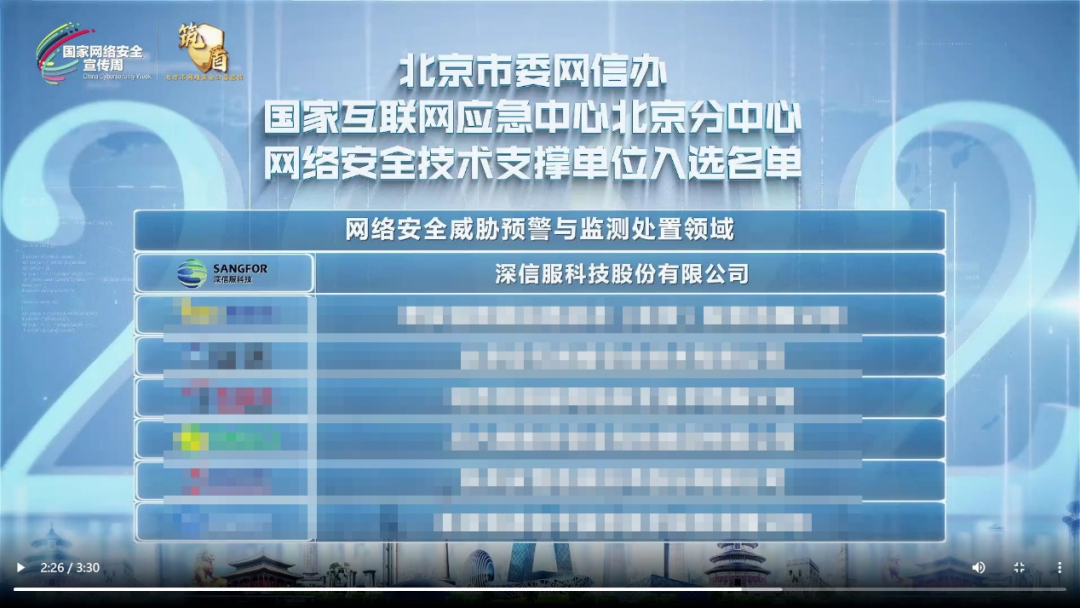 近日,北京市委网信办网络安全技术支撑单位遴选结果正式公布,深信服顺利入选“网络安全威胁预警与监测处置”类支撑单位!本次遴选历时一个月,面向国内头部网络安全企业,聚焦网络安全威胁预警与监测处置、数据安全与移动互联网安全、工控系统及物联网安全三大领域,也是对申报单位综合能力、网络安全技术实力、服务保障能力等全面的考察。