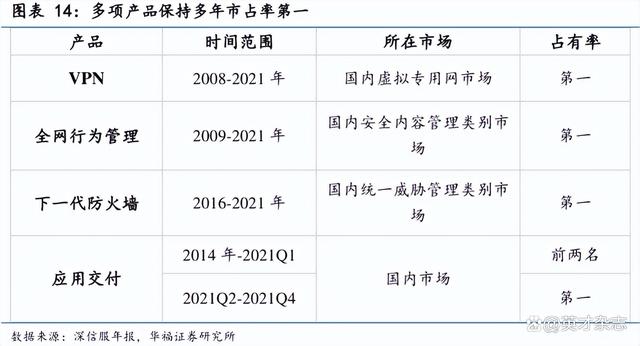 让各路资本相爱相杀的深信服是我国网络安全龙头,主要产品VPN、上网行为管理、应用交付、下一代防火墙等核心产品连续多年市场份额位居行业前两名或第一名,连续4年入围了Gartner国际魔力象限,其中下一代防火墙在2021年首次入围Gartner“远见者”象限。